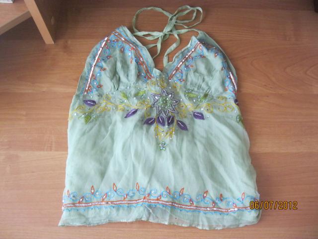 Zalsvos spalvos maikute susirisanti gale per kakla ir per nugara. Parasyta M dydis bet gal siek tiek pamazinta, reiktu pasimatuoti. Su etiketemis.
