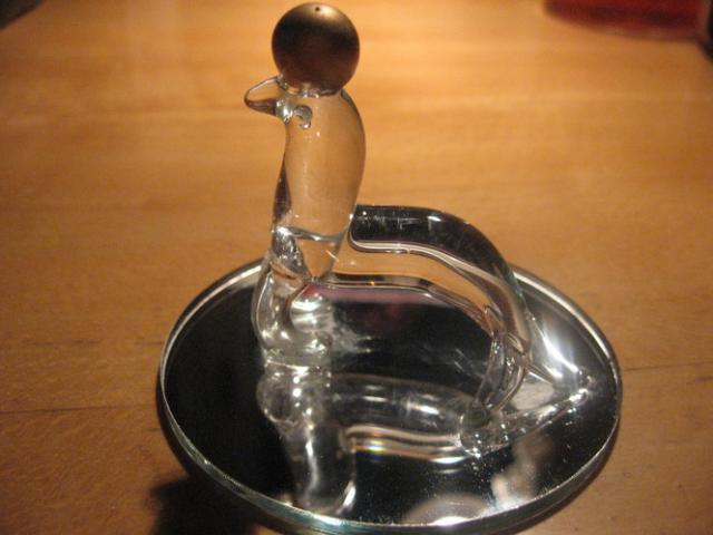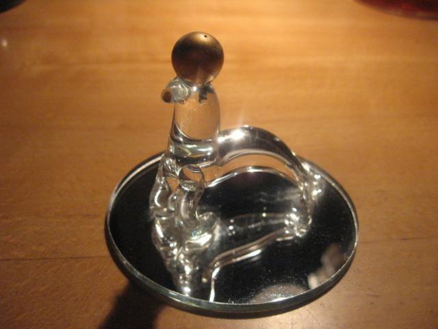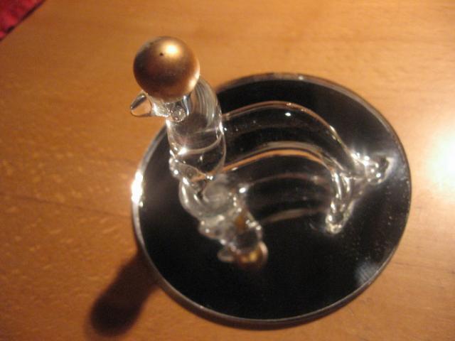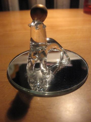 Padaryta iš stiklo, padėta ant veidžodžio, ant viršaus - aukso spalvos burbuliukas. Nesubraižyta, tik ne itin gerai nuvalyta :)