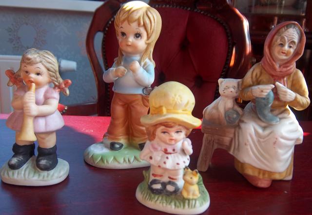 Skulptūrėlės. Aukščiausia(13cm)- mergaitė su "ragatke "kišenėj su defektu. Kitų stovis puikus. Viena-1,5. Visos kartu-4e.