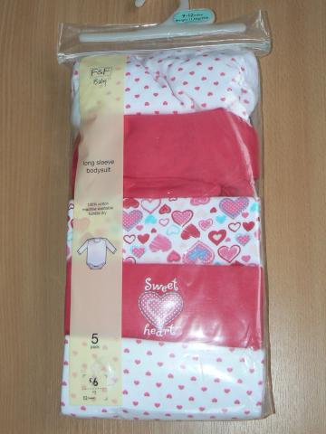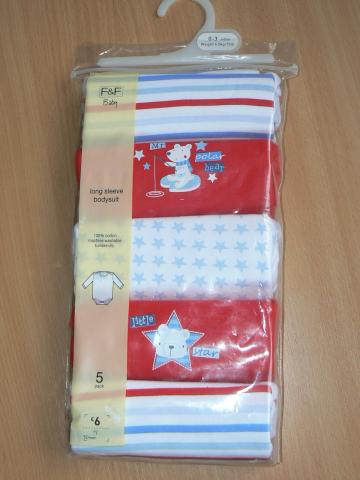 Nauji smėlinukai ilgom rankovytėm. 100 % medvilnė. Gražūs, ryškūs paveiksleliai. Dydžiai : 0-3 mėn. 6,5 kg. 62 cm, (su meškučiais, dryžuoti) 9-12 mėn. 11,5 kg. 80 cm.( mergaitiški su širdelėm) 18-24 mėn. 92 cm. (su meškučiais, dryžuoti) 1 vnt.- 8 Lt, perkant visą pakuotę 5 vnt.- 34 Lt