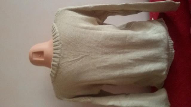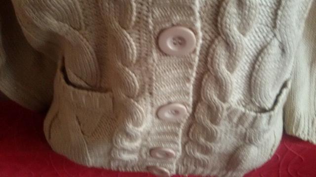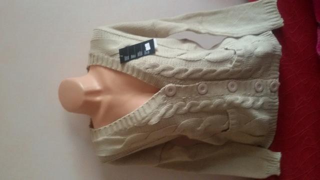 Naujas moteriškas smėlio spalvos megztinis. Su raštais. Ilgos rankovės. Užsegamas. Yra dvi kišenės. Sudėtis: 100 proc. akrilo. Dydis nurodytas M/L, tačiau tinkamas dėvinčioms M dydį.