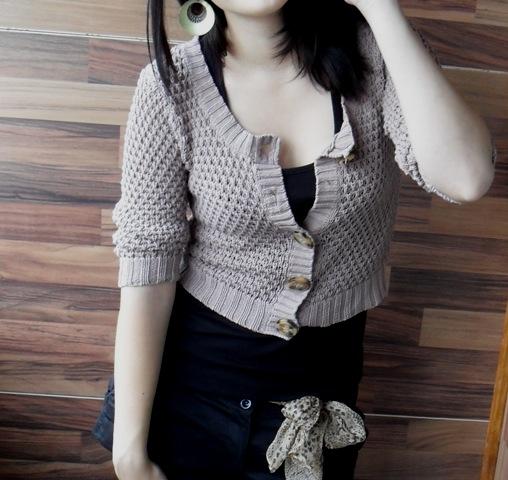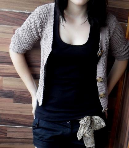 Smėlio spalvos svarkelis/bolero nertas . sotas . žiemą galima po apačia golfyte , vasarą palaidinę. universalus.Su tigrinėmis gigantiškomis sagomis.