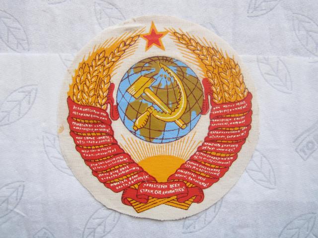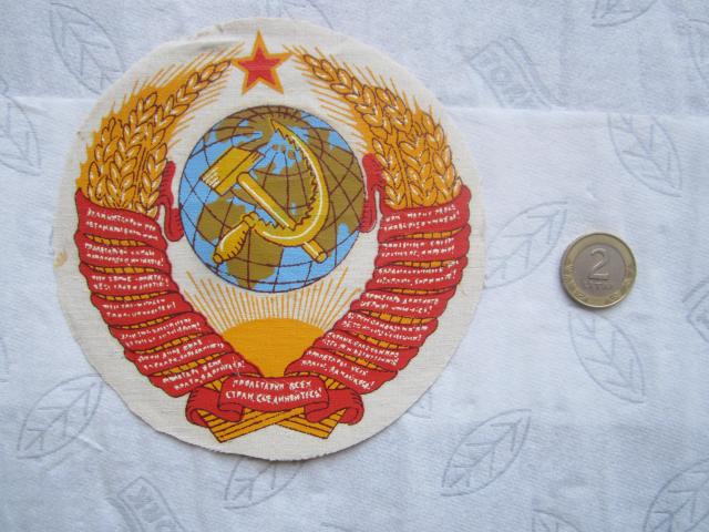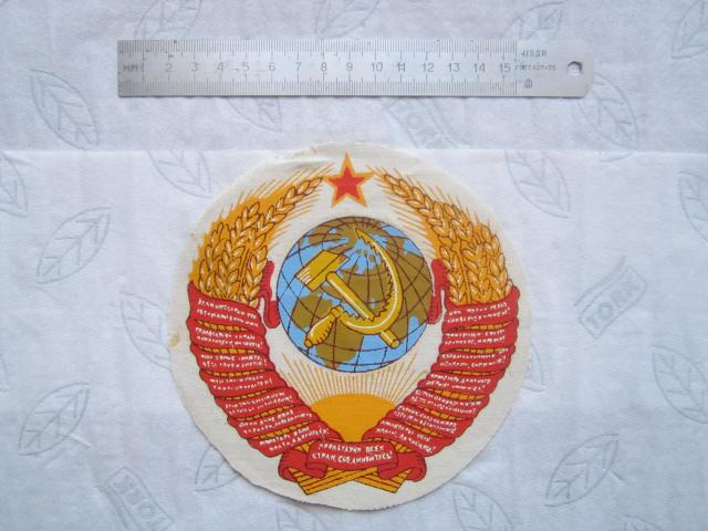 Sovietines tematikos herbas: "Kujis ir pjautuvas". Pats herbas yra medziaginis bet uzklijuotas ant popierinio pagrindo. Visa kita... daikto ismatavimai, kosmetinis stovis ir t. t. gerai matosi nuotraukose. P. S. Uzrasas ant herbo: "Пролетарии всех стран, соединяйтесь!".
