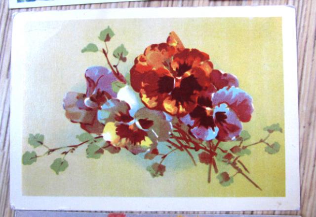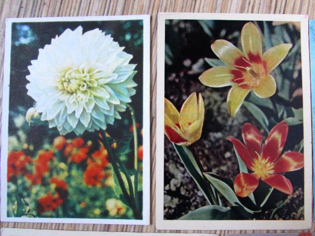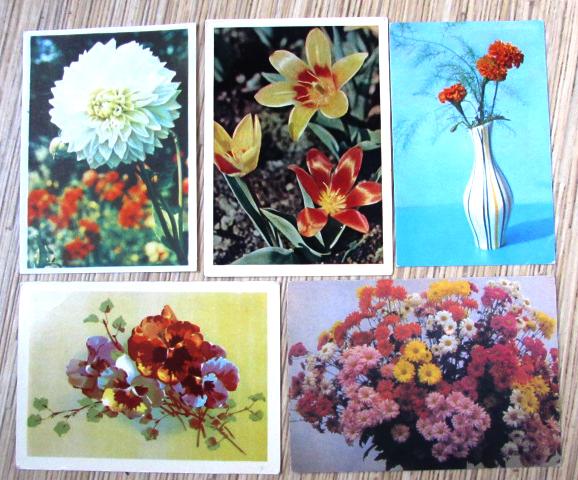 Vieneto kaina - 0.50 eur. Chrizantemų puokštė - 1971 m. Jurginas - 1966 m. Tagetės vazelėje - 1973 m. Žemos tulpės -1964 m. Našlaitės - 1970 m. Perkant visas 5 atvirutes, kaina 2 eurai.