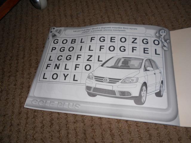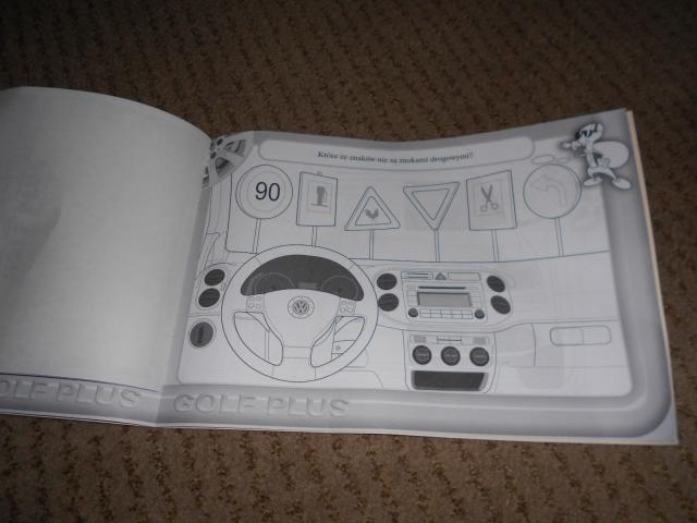 Kažkada išsimainiau, bet taip ir nepanaudojau :D Lenkiška spalvinimo knygutė "Volkswagen Golf plus". Nuspalvinta tik 2,5 puslapio ir nelikę nei vieno lipduko. Šiek tiek apsilamdžiusi knygutė.