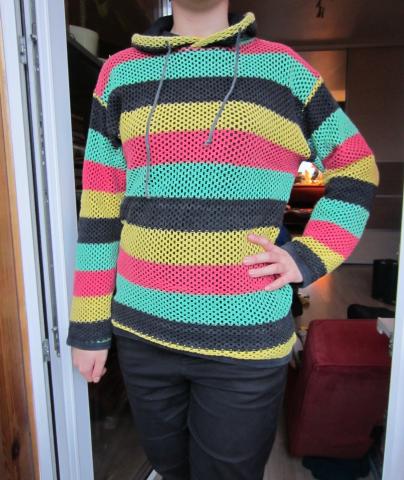 spalvotas dryžuotas bliuzonas su gobtuvu