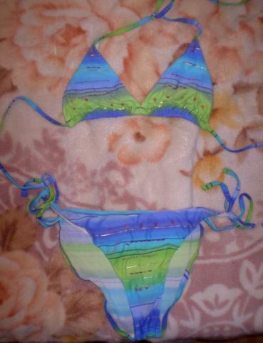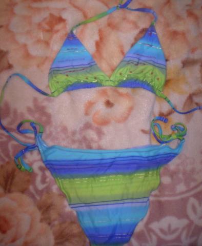 Simpatiškas maudymukas, suraišomi tiek viršus, tiek apatinė dalis. Gaivus ir patogus. (nuotraukoje kiek pasiglamžęs).