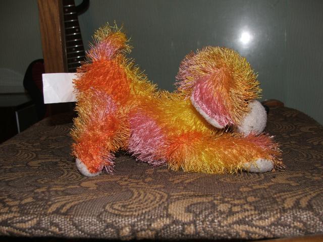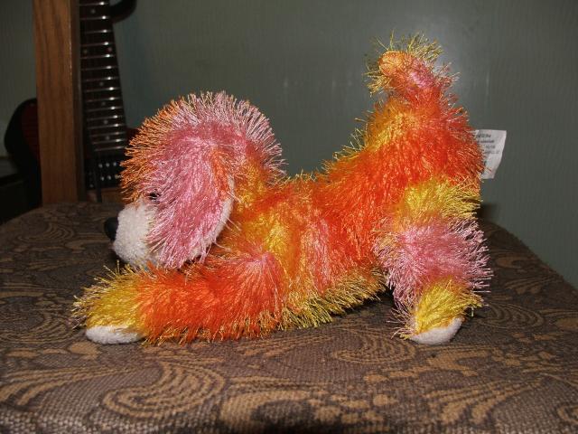 Geltonos, rožinės ir orandžinės spalvos šuniukas. Tinka dovanoms