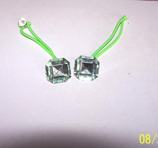 Dvi sviesiai zalios gumytes su blizgiais akmenukais. Akmenukai didoki. Bukle puiki, tik vienos gumytes gale nera zalio bumbuliuko.