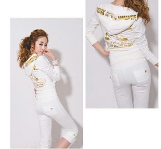 Dvi spalvos. Išmatavimai: megztukas: ilgis 55cm, biustas 86cm, pečiai 36cm, rankovės 59cm; kelnės: ilgis 74cm, liemuo 62cm, klubai 94cm. Medžiaga: medvilnė.