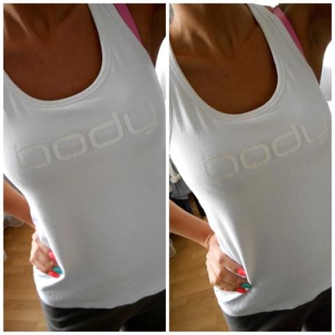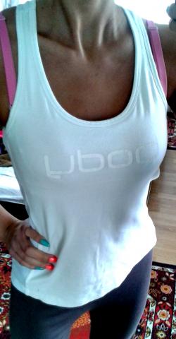 Baltos spalvos , sportinė bliuskutė su specialiu krutinės laikikliu (liemenelė), Dydis tiks nuo xs iki s tampri Ismatvimai ilgis nuo sleikuciu 55 cm nuo pazastu ilgis 37 cm per krutine 35 cm