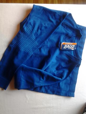 Visai naujas (nematuotas) mėlynos spalvos sportinis "Crivit" trikotažas, tinkantis intensyviam sportui. Tampri medžiaga leidžia (vienu dydžiu mažiau ar daugiau) jaustis patogiai. Nevaržo. Galima nešioti tiek atviroje pusėje, kiek ir po džemperiu. Palaiko tinkamą kūno temperatūrą. Labai gerai praleidžia orą. Populiaru dėvėti kalnų žygyje.
