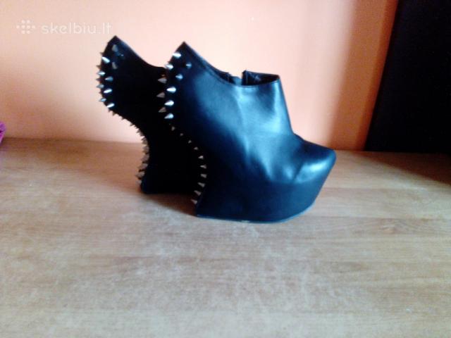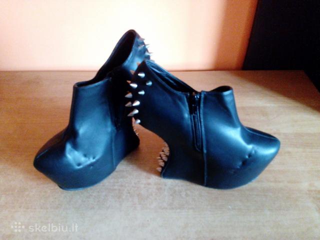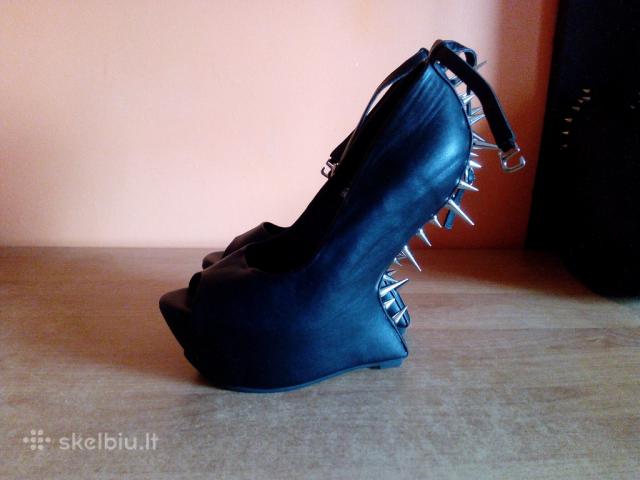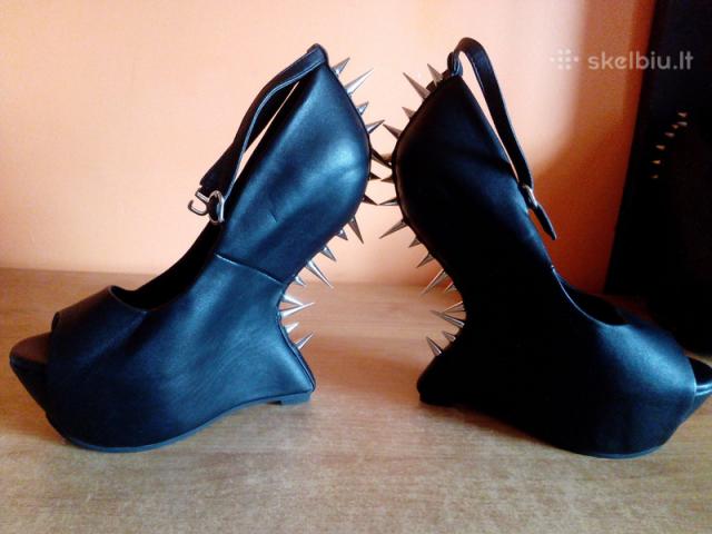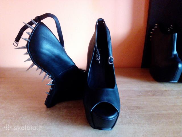 Įdomūs, bekulniai moteriški bateliai su spygliais. Puikiai išlaiko lygsvarą. Blizgi medžiaga. Nauji, nenešioti. Be defektų. = 4-7 Nuotraukos - KITI BATELIAI: 37,5 Dydis. Dirbtinė oda, transportuojant liko spygliukų įspaudai. Apsiavus, defektas matosi labai nežymiai. Nauji, nenešioti. - šie 10 Eurų. Jei pageidaujate - Atsiųsime į bet kurį miestą už 2,5 Euro. Apie batus Dydis 38 Spalva Juoda Sezonas Universalus Būklė Nauja
