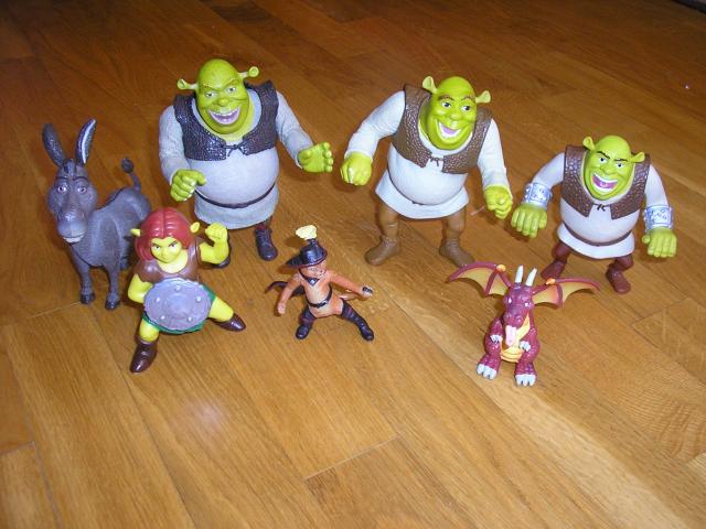 Sreko filmuko personazai. Bukle puiki, vidutinis srekas 5eur. maziausias skleidzia garsa kaina 6eur. Fiona 5eur, drakonas 5eur, katinas 4eur (nulauztas kardas). Didziausias srekas 9eur. asilas gale paspaudus mygtuka judina apatini zandikauli 10euru.