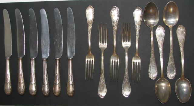 Seni tarybiniai. 5 peiliai (2 iš 5 peiliai apgadinti), 5 šakutės, 5šaukštai.