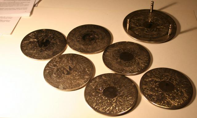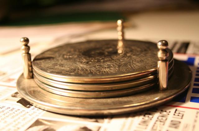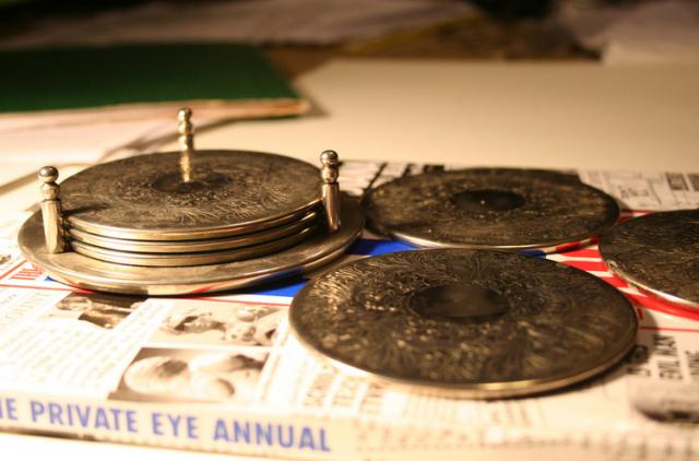 Metaliniai padekliukai. Nenauji. Yra tarsi dėžutė į kurią sudedami visi šeši padėkliukai kai nenaudojami.