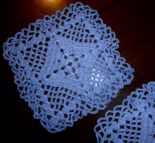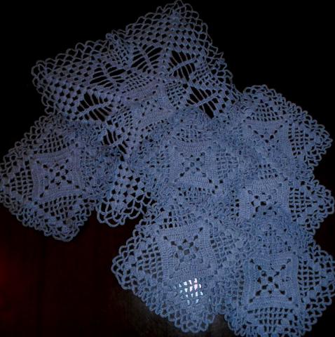 Komplektas susideda iš septynių dalių: viena didelė ir šešios mažos. Šviesiai violetinės spalvos. Servetėlės nertos iš minkštų siūlų.