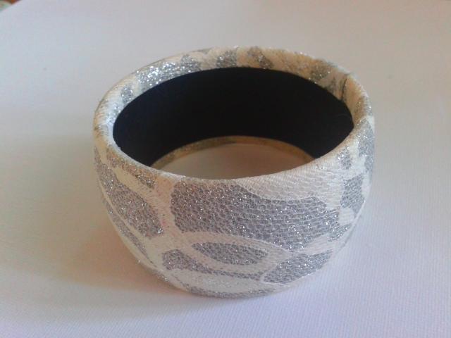 Stambi apyrankė, baltos medžiagos su sidabriniais raštais