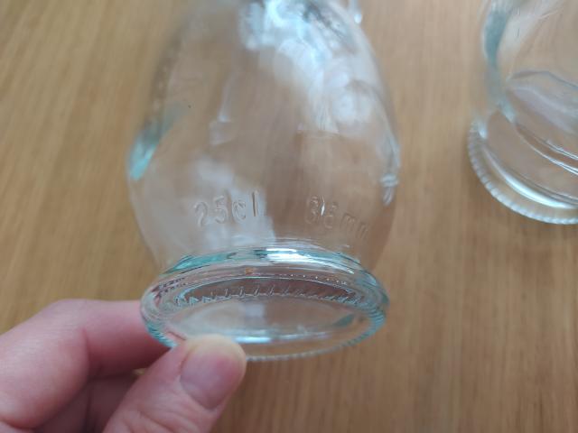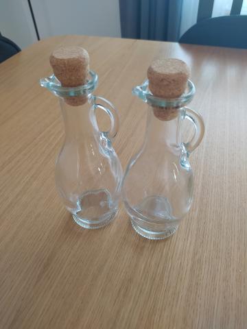 Stikliniai aliejaus indeliai. Naudoti, bet išplauti. Aukštis - 18 cm su kamščiu, skersmuo- 7 cm, skysčio tūris - 250 ml.