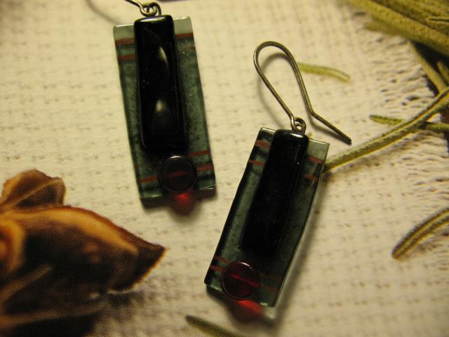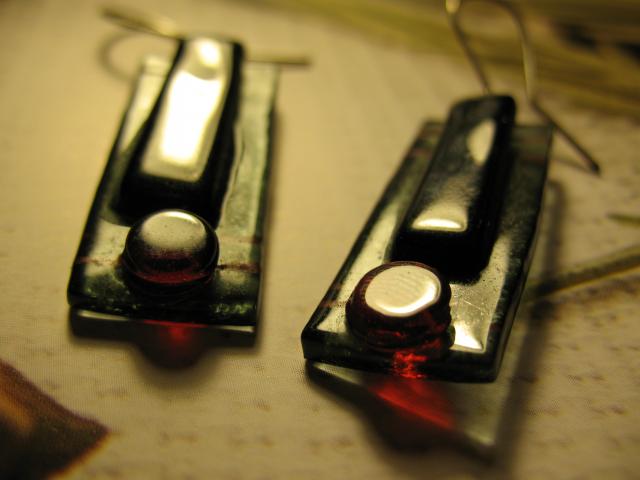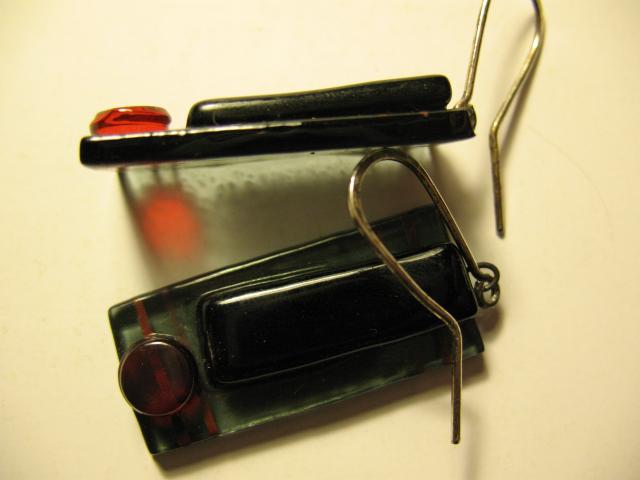 Stikliniai rankų darbo auskarai, gaminti iš raudono, pilko ir juodo stiklo, su sidabriniais kabliukais, vienetiniai