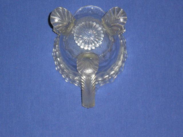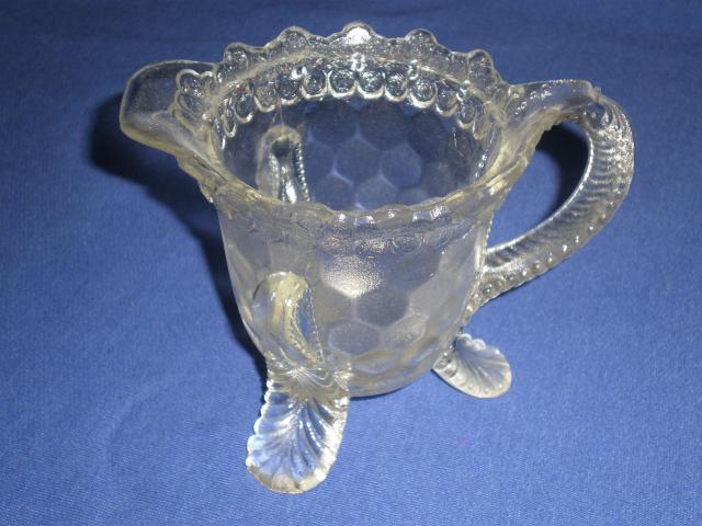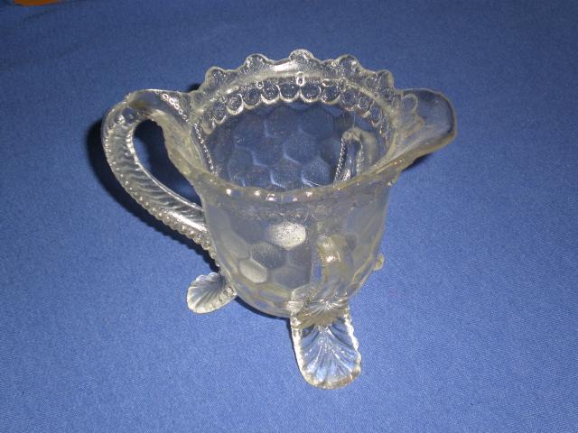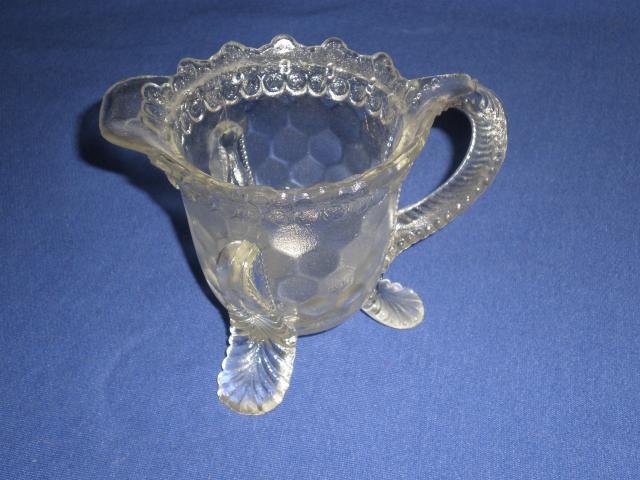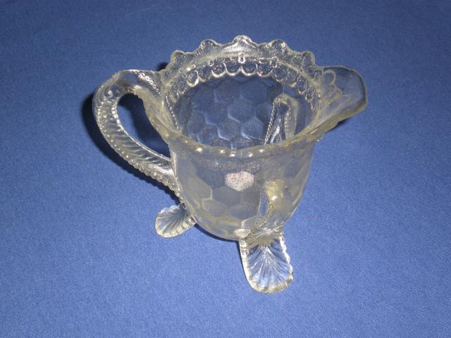 Stiklinis senovinis indas ant triju kojeliu ir su rankenele