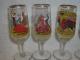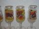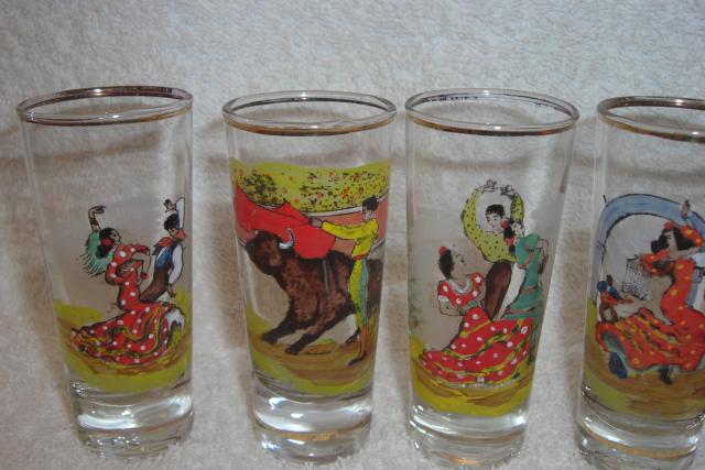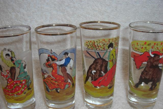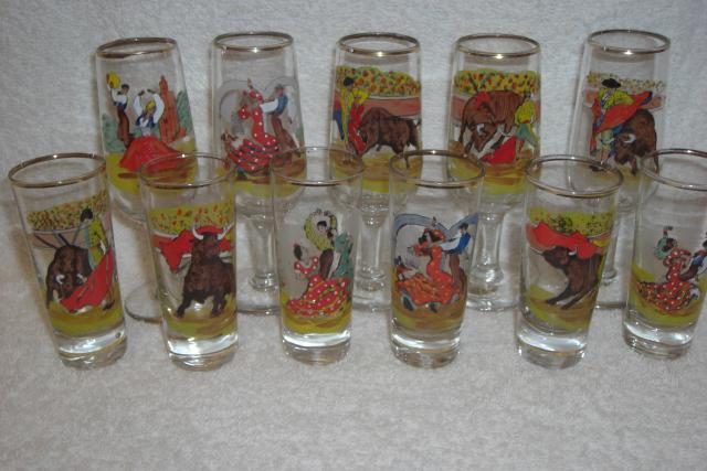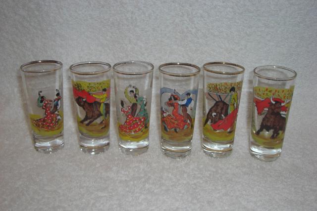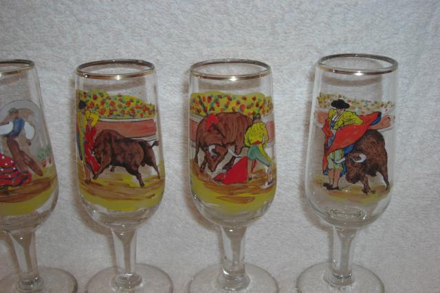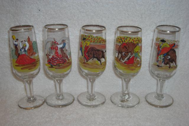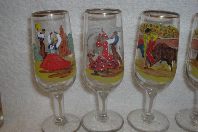 6 vnt stikliuku( 2 foto -visi turimi ir 3-4 foto kokie rastai) ir 5 vnt taureliu ( 5 foto - visos turimos ir 6-7 foto, kokie rastai...... deja, viena suduzo bevezant (: ) . Su auksiniu apvadeliu virsuje. Piesta rankomis .....Ispanija.