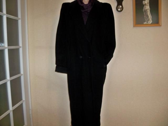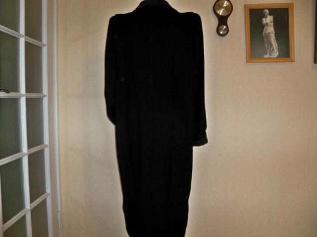 Puikus stilingas juodas paltas. V formos iškirptė. Susisega ant vienos sagos.Tikrai verta pamąstyti kam reikia. Jokių dėmių nėra, čia tik mano taip nevykusiai nufotkinta :) Sudėtis - 100 proc. vilna.