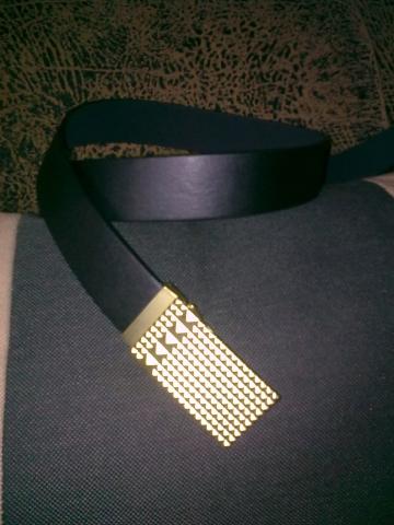 Klasikinis juodas diržas su akį patraukinčia sagtimi. Jį dėvėti galima su bet kokio stiliaus suknele