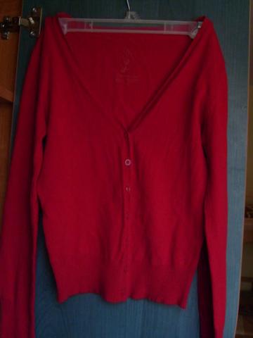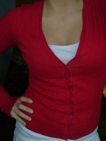 Raudonas stradivario susegamas megztukas. panešiotas, bet nedaug, ir geros būklės, tiesiog man spalva nelimpa. Antroje nuotraukoje matosi kad sagutės apvalios ir tarp ju viena sirdutė, taip tūri būti.
