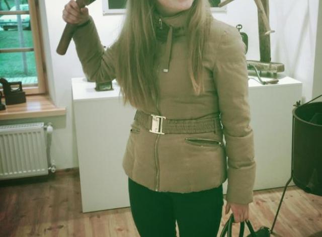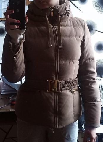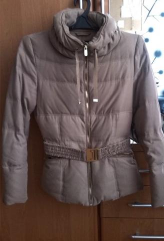 Žieminė moteriška striukytė, Dydis- M. Spalva auksinė/šviesiai ruda. Šiek tiek apsitrynęs dirželio metaliukas.