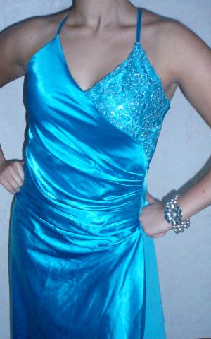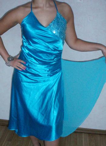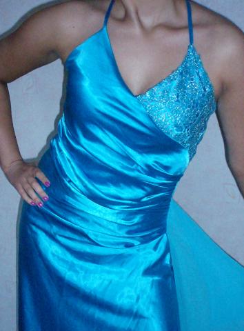 Nepaprastai gražaus modeliuko ,žydros spalvos, puošni suknelė.Šiek tiek žemiau keliukų. Nedaug bet šiek tiek pasiaurinta, bet turint noro galima atsiardyti (šleikutės taip pat patrumpintos,bet nenukirptos ,visi pasiaurinimai atlikti nematomais išorėje dygsniukais, tačiau labai lengvai atardomi). Vilkėta vienose vestuvėse,labai daili ir gražiai krintanti, atrodo prabangiai ir tvarkingai. S dydis, atsiardžius galėtų būti S/M :)