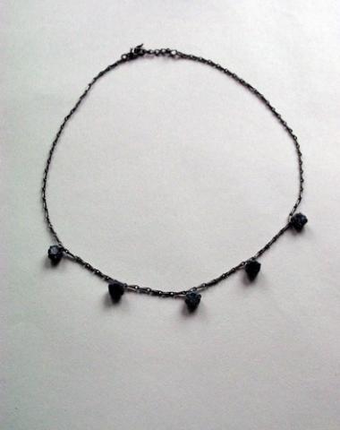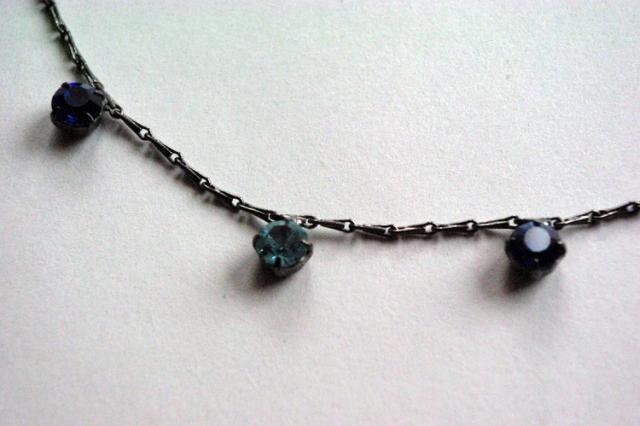Labai daili, visiškai nauja pilko metalo grandinėlė su mėlynais ale 'deimantais'. Kai fotografavau, buvo labai apsiniaukę, tai nesimato viso grožio :)