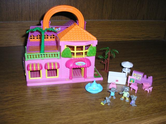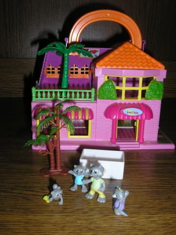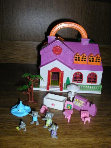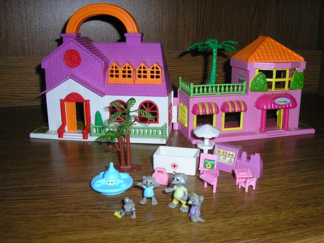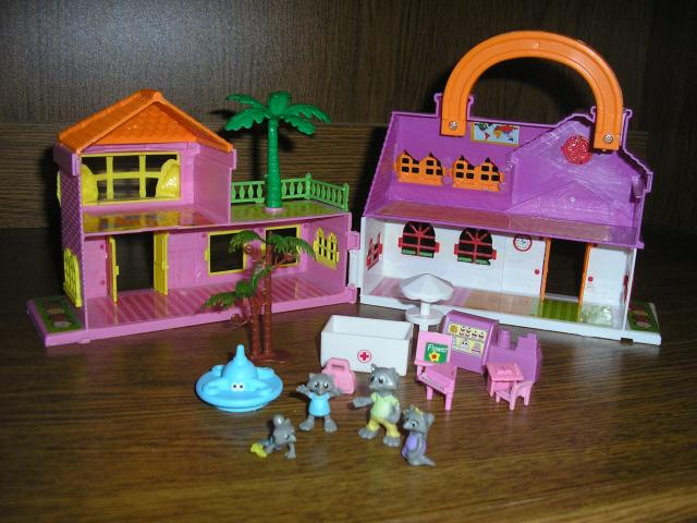 Sudedamas namelis su rankenele su mazais gyvuneliais. Mini namelis su mini gyvneliais. Yra namelio dezute su kuria buvo pirktas. Namelio plotis 2x16cm dugno plotis sulankstyto namelio (neisskleisto) 16x12cm, aukstis 13cm be rankeneles, su rankenele 17cm. Didziausio gyvunelio dydis 3cm.