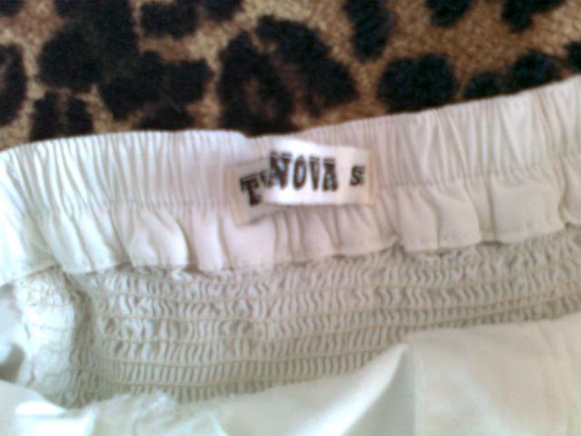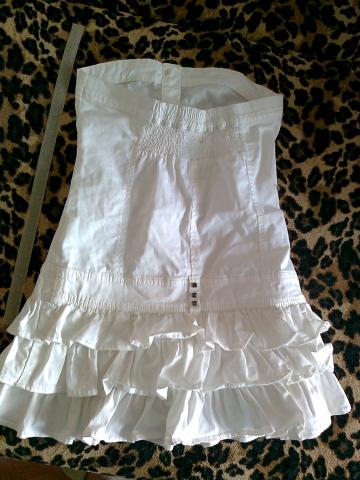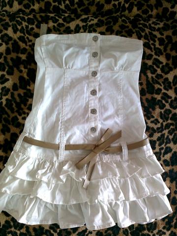 Ši suknelė dėvėta apie 2 kartus, ji tiktu panelei su išmatavimais : krūtinė- 1,2,3 dydžiai, liemuo- 62 cm, klūbai-79 cm, sėdmėnys- 90 cm , bet prie šių išmatavimų galima laisvai pridėti po kokius 2 cm, išvaizda nepasikeistų. Suknelė yra trumpa, taigi, panelės, jeigu turite pavydžius vaikinus, geriau tokios nepirkti ;]] o šeip spalva nėra ryškiai balta ( ir nebuvo balta kai pirkau), ji daugiau eina kaip balta-kreminė, kad kaiptik dėrinasi prie diržo spalvos ;] Kaina apie 30 lt rašykite : jekyyy@mail.ru