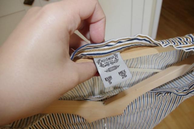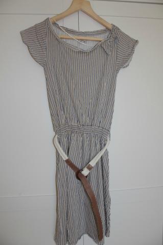 Pieno spalvos,smėlio ir tamsiai mėlynos spalvos dryželiais puošta medvilninė suknelė su netikros odos/virveliniu dirželiu(PULL&BEAR)