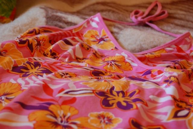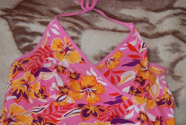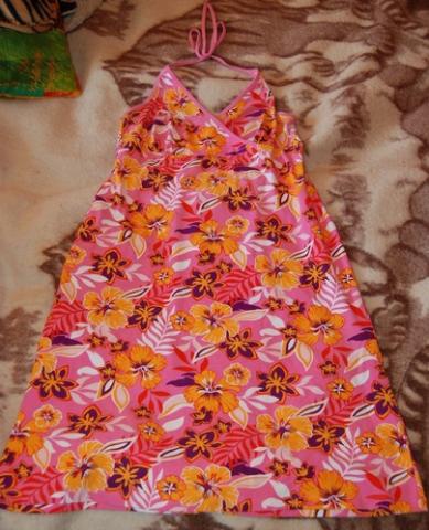 Daili vasariška, ryški suknelė, raišteliais susiriša už kaklo. Dydis M/L. Labiau M :)