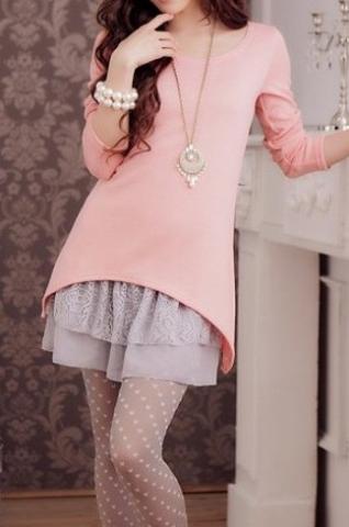 Iš dviejų dalių. Dvi spalvos. Viršutinė dalis: ilgis 60cm, biustas 88cm, rankovės 57cm, pečiai 35cm. Vidinė dalis: ilgis 75cm, biustas 78cm, Medžiaga: medvilnė + nėriniai.