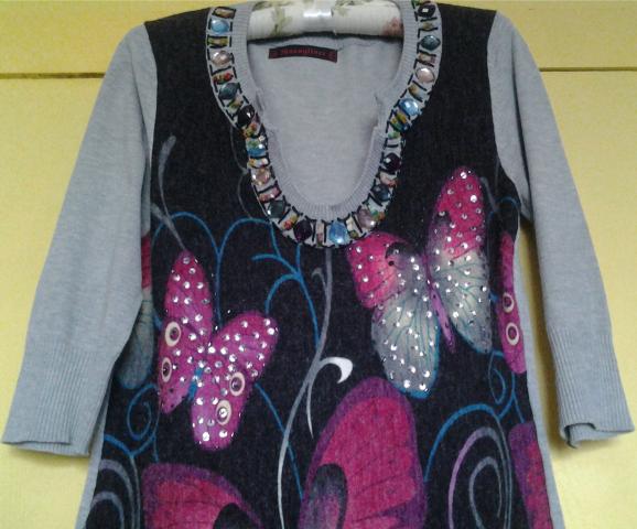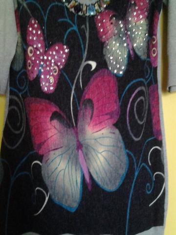 Labai graži,jauki,tampri suknelė papuošta drugeliais ir spalvotais stikliukais. Pirkta Marli parduotuvėje.Neištemptos suknelės krūtinės apimtis 84 cm, visos ilgis 87 cm, rankovės trijų ketvirčių,ilgis nuo peties 41 cm,petukas 9,5 cm,iškirptės ilgis 21 cm.Sudėtis 80% medvilnė, 20 % lykra.