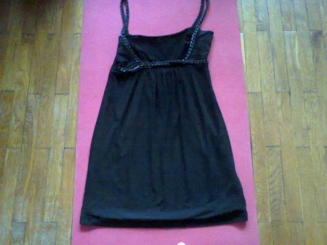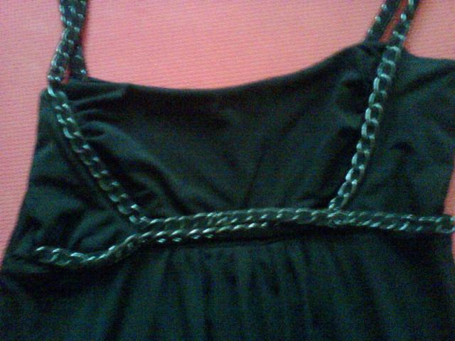 Juoda suknelė su grandinių tipo petnešomis ir papuošimais po krūtine.