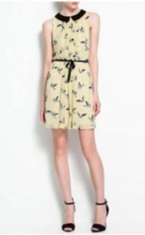 Romantiškai vasariška suknelė su paukščių motyvais, sujuosiama plonu juodu dirželiu ir papuošta juoda apykakle. Idealiai tiks Vintage stilių mėgstančiai merginai. Dydžiai: S, M, L Medžiaga: šifonas Spalvos: geltona, juoda Sezonas: pavasaris, vasara