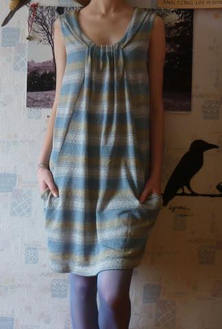 Drabužis siūtas pagal Burdos iškarpą. Tvarkingai, gražiai, be pamušalo :) Medžiaga plona. Puikiai galima nešioti tiek prie tympų, tiek kaip suknelę. Spalvos mėlynos atspalviai. Su kišenėmis. (ten, kur ties nuotrauka padėtos rankos). Dydis S/M