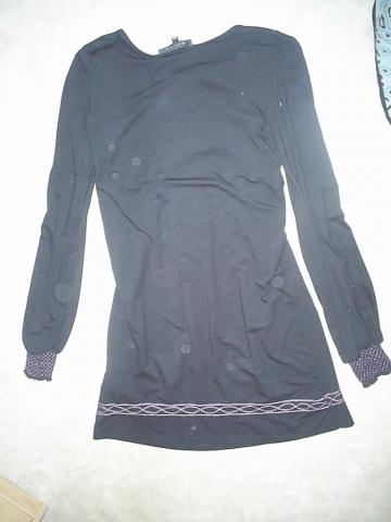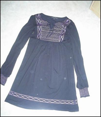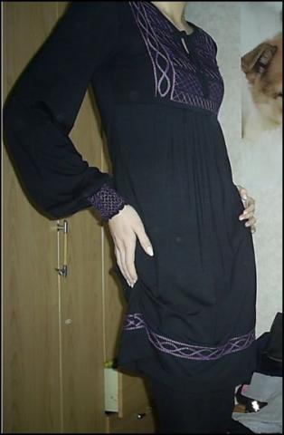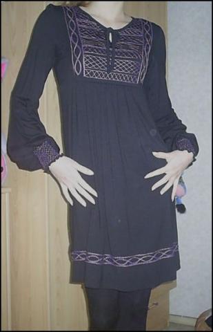 labiausiai man patinka šios suknelės medžiaga 93 prc viskozėz ir 7 elastano,todėl medžiaga yra krentanti ir labai gražiai išryškina figūrą, suknelė juodos spalvos, iš priekio ant rankovių ir apačioje yra išsiuvinėta violetiniais siūlais, man ji šiek tiek primena liaudišką apdarą;] būklė kuo puikiausia, nešiojau gal 4 kartus, kadangi ne mano stiliaus ji šiek tiek.