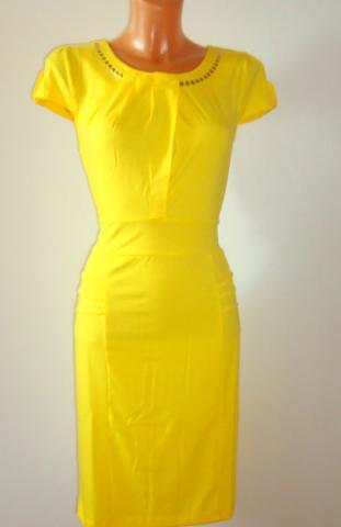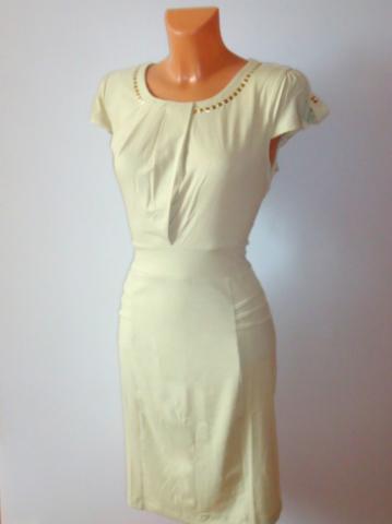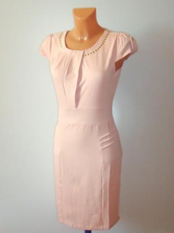 Graži suknelė trumpomis rankovėmis , nugaroje segasi aukso spalvos užtrauktukas. prie kaklo ir puošta metaliniais blizgučiai. Sudėtis : 65 proc. polisteris , 35 proc. medvilnė. Medžiaga švelni , maloni prie kūno. Puiki vasariška suknelė. Suknelių dydžiai skirtingi, dėl patikusio dydžio paklauskite.
