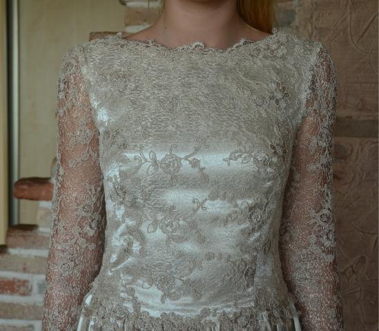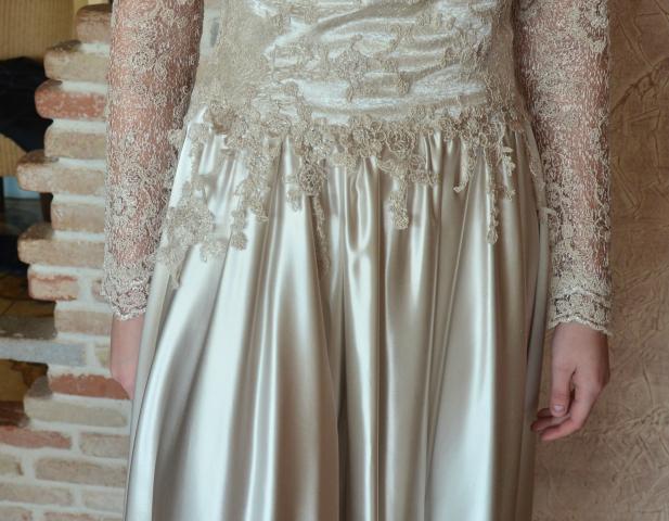 Šampano spalvos ilga proginė suknelė su ilgomis rankovėmis. Ilgis 150cm aukštakulniai 13cm rankovės 58cm lėmuo 65cm krutinė 80cm klubai 90cm. Užsidėta vieną kartą. Siūta pagal specealu užsakyma. Kreiptis telefonu 861265504