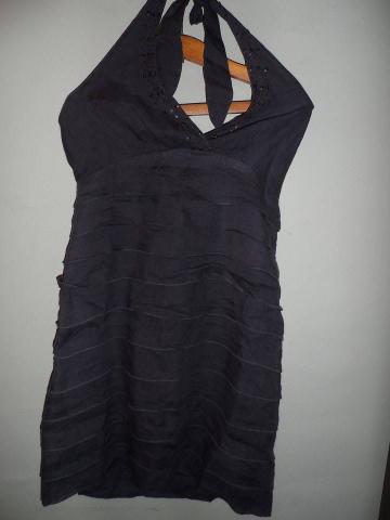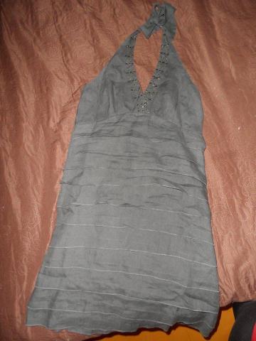 Puiki pilkos spalvos užrišama per kaklą suknelė.