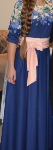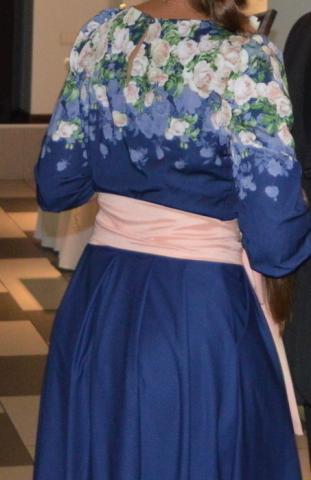 Graži, vieną kartą dėvėta suknelė. Dydis 36-38. Ilgis apie 170 cm. Per liemenį juosiasi diržas, kurio galima ir nesidėti. Labai patogi suknytė. Priekyje yra kišenėlės. Pati suknelė labai puošni, tinka įvairioms progoms.