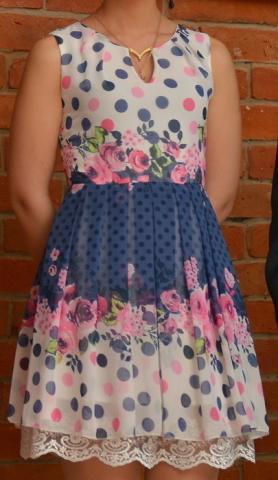 Dėvėta, tačiau be defektų suknelė. Tinka tiek 36, tiek 38 dydį nešiojančiai merginai. Ant juosmens galima užsidėti dirželį. Puikiai tiks įvairioms progoms.