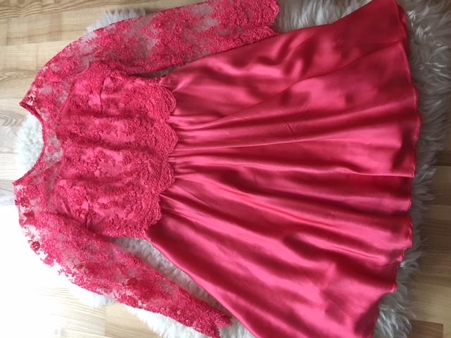 Ši suknytė yra dėvėta tik vieną kartą, tikro šilko medžiaga ir puošta gipiūru. Pamušalas irgi šilkinis. Ji yra siūta, tiktų mergaitei, nešiojančiai S/ M dydžio drabužius.