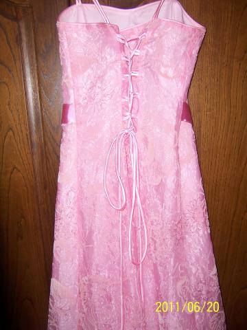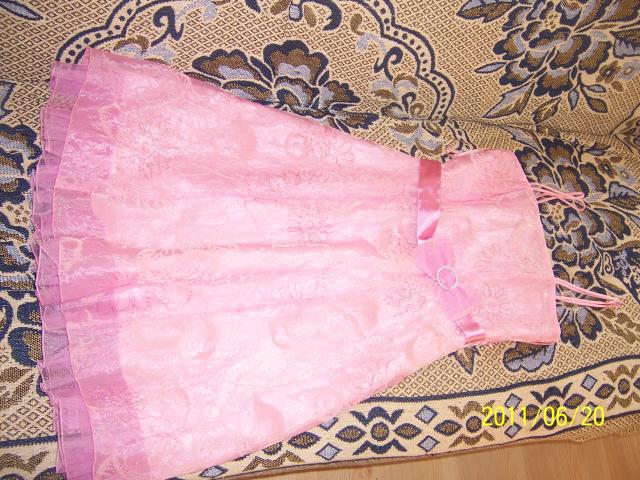 Labai grazi progine, rozine suknele ant petneseliu. nugaroje yra uztrauktukas, ir dar susivarsto raistukai,nuotraukoje jie matosi. priedo yra rozinis salikelis.
