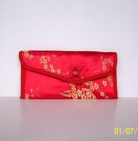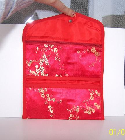 Labai grazi, raudona tarsi silkine ir su aukso spalvos siulais siuvinetomis gelemis. Viskas puiku, tik ten kur buvo uzsegimo knopkyte ji netvirtai laike - tai i vieta ideta sagyte. Manau dar patogiau.